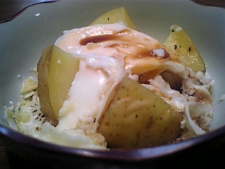 じゃがいも 2個 (庭で採りました。皮をむいたら、1cm位に切って水に浸しておきます)